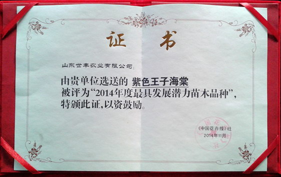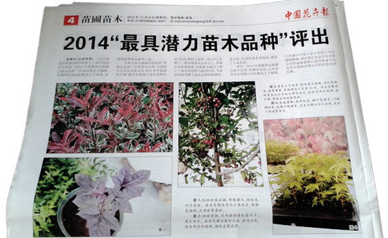 由《中国花卉报》社组织的第十二届中国苗木交易会“2014年度最具发展潜力苗木品种”评选结果近日揭晓,参展单位选送的紫色王子海棠、金陵黄枫等展品最终入选。