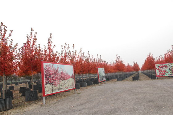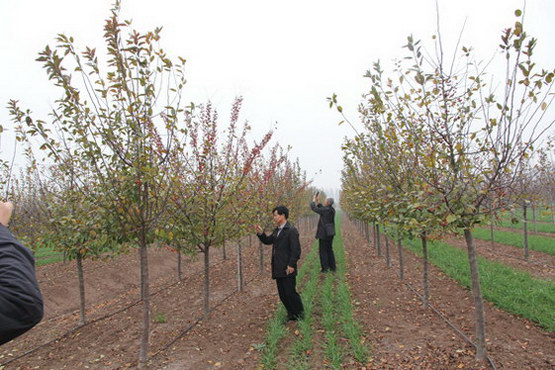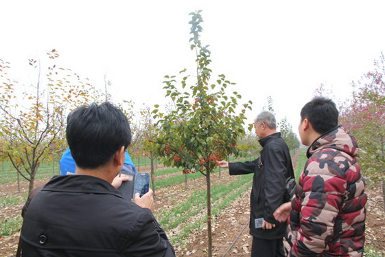 2014年11月12日上午,河北省张家口市高局长和张总一行来我公司基地参观考察 。公司园区负责人负责接待,向高局长一行介绍了了公司近期的发展状况和未来的发展方向。随后参观了美国红枫种植基地和北美海棠种植基地。最近正是夕阳红红枫变色的季节,夕阳红红枫是美国红枫系列中最经典的代表品种。是秋色表现最好的品种之一,也是国际绿化市场上应用量最大的乔木。高局长一行在参观中详细询问了彩色苗木在我公司的育苗经验,与我公司专业技术人员探讨容器苗的栽培技术。并称赞我公司的夕阳红红枫好像落日晚霞的颜色,映红了世丰基地,色彩红艳,让人眷恋。