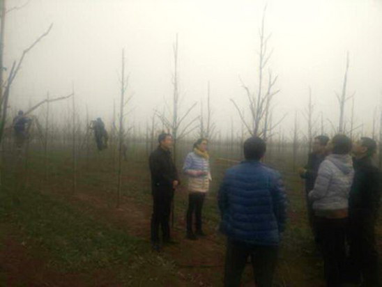 世丰农业——美国红枫冬季整形修剪 2015年1月16日,火博app技术人员在园区基地,组织了一次美国红枫冬的季整形修剪。世丰农业苗木基地的种植模式借鉴了美国斯密特苗木公司的经验。美国红枫树干的分枝点统一定在 1.8 米,偏差超过 1 厘米。各品种苗木规格一致,每年严格控制生长量,有效保证了苗木品质。 虽然今天雾霾很大,但大家丝毫没有受到雾霾影响。认真探讨修剪技巧 修剪过后的美国红枫,整齐如一 整形修剪技术 1.当年生苗高可达30-50cm,经过1~2年定植,当基径达1-2cm粗时,在冬季修剪,一般留一主干,剪除基部萌蘖枝及分枝点较低的侧枝,在离地80-100cm处主干短截,细弱苗可略低壮苗可稍高。对主干各主侧枝应选定长势适中,方向适宜枝条,并短截侧枝1/3,使主干与各级主侧枝分布合理,上下几层错落有序。 2.美国红枫每年休眠期,剪除枯枝、病枝、并列、内生枝后,疏除影响主技生长的辅养枝、徒长枝、重叠枝等,短截生长过旺徒长枝,使树冠保持匀称。逐年剪除生长较低的枝条,以抬高主干分枝点,使树冠内通风透光。注意不要在生长期修剪,以免伤流影响长势。 3.注意随时剪除砧木上的萌芽。高接换头生产大规格红枫,先在适宜部位选留精壮萌芽,养好砧木,然后在春季萌芽前嫁接优良品种。通过2-3年培养,能形成较大树冠用于绿化,但应注意随时剪除砧木上的萌芽。采用粗干劈接的要注意伤口愈合。 4.移植与出圃修剪:小苗可裸根,大苗带泥球。在休眠期移植成活率较高。疏剪过密枝叶,做到树冠通透,树形不变为原则,修剪不宜过重。生长期移植可多摘叶,注意叶面保湿。