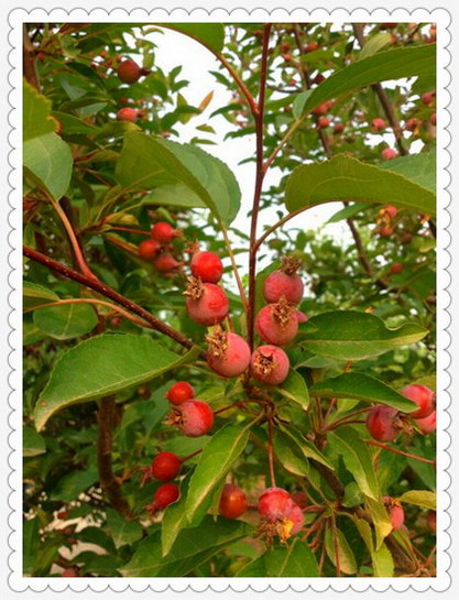 7至8月是观赏夏果的最佳季节,这时的叶色凝重稳定,衬托着那一树红透透、黄橙橙的成熟果实,可谓美轮美奂,喜气洋洋!能够食用的大果“道格”美艳惊人,香气扑鼻;“绚丽”的叶色已经变成可爱的苹果绿,衬托着满树洋红色的美果,远看竟像是开了一树红花;“红叶红花垂枝北美海棠”果实红透透的,像一串串红宝石垂挂在随风飘逸的柔枝上,娇艳欲滴。