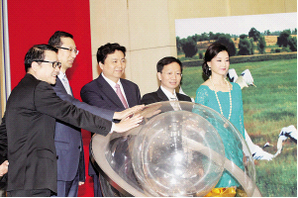 赵树丛、胡占凡等共同触摸水晶球,启动“美丽中国·湿地行”大型公益活动。记者蔡鸿  摄