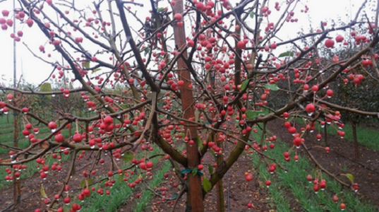 我们在现场参观的这一天,天空不大做美,密集的秋雨夹杂萧瑟的寒风整日不停,而且一阵紧似一阵 。但在雨天里看到的美国红枫,别有情趣,众人的兴致依然高涨。尤其是美国红枫最新品种'红点',虽然没有灿烂的阳光陪伴,但此时已经从翠绿的叶片实现华丽转身,成为绚烂夺目的火红色,"霜叶红于二月花",是毫无疑问的。此时恰是深秋,一片片北美海棠恰是闪亮登场的最佳时候,一嘟噜一嘟噜红果,缀满了枝头,由于品种不同,果实有大有小。但在雨水的滋润下,一粒粒果实都悬挂着亮晶晶的水珠,如玛瑙一样晶莹剔透。