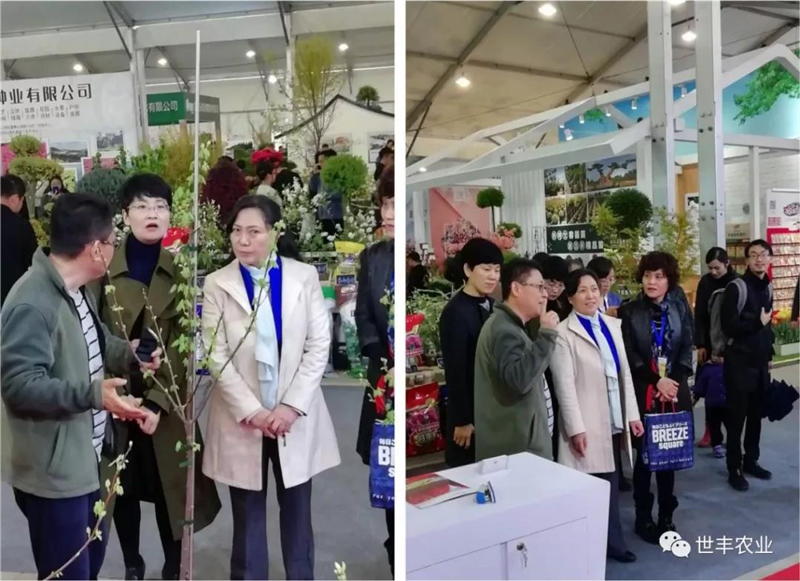 展会现场中国花卉协会副秘书长杨淑艳、山东省林木种苗协会秘书长王大赢、北京林木种苗产业协会秘书长王亮、河北省林木种苗协会秘书长李书战等相关企事业单位大咖纷纷莅临世丰展位参观交流,工作人员依次向其介绍了我公司的新优品种及其特点和适合的园林应用案例,参观领导对我公司的苗木品质认可度极高,并希望能与更多的公司合作,为国家的生态建设、园林的绿化彩化事业做出自己的贡献。